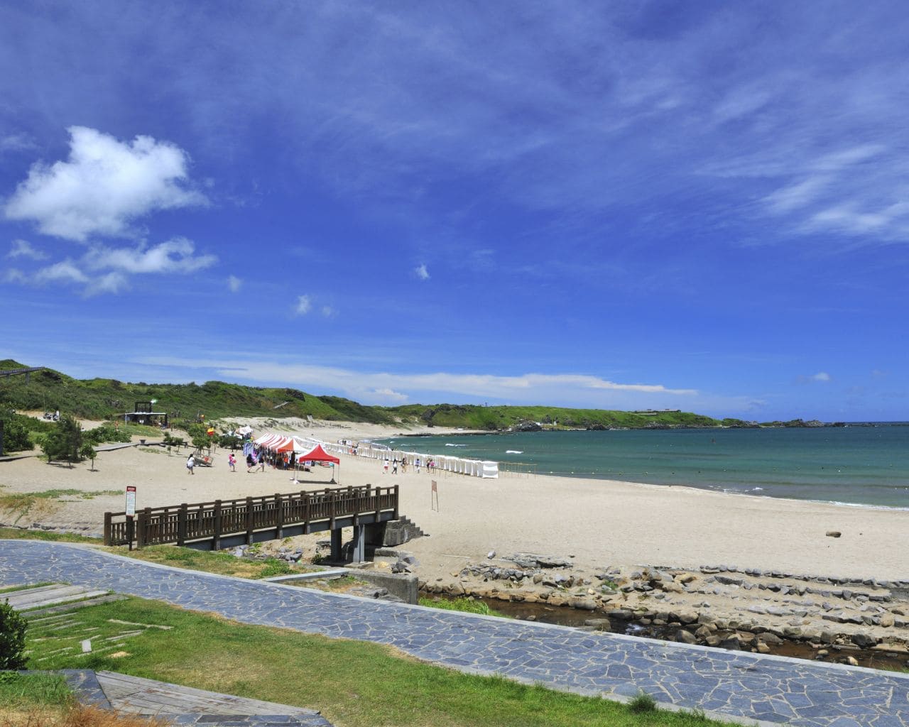 Nestled between Linyanbi and Fugui Cape in New Taipei’s Shimen District, Baishawan Beach—also known as White Sand Bay—is a gently curved, shell-rich coast spanning approximately 1 km. Its pristine sand and clear blue-green waters make it one of the most tranquil seaside spots in northern Taiwan. A shallow freshwater stream runs through the middle of the beach, creating a safe splash zone ideal for families. Sunbathing, swimming, windsurfing, and SUP are popular here, and the sunset views over the sea offer a serene end to any coastal day trip.