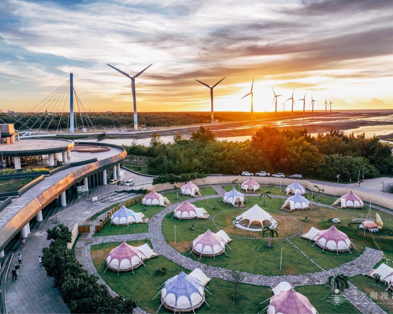 Gaomei Wetlands, at the southern mouth of the Dajia River in Taichung, spans approximately 1,500 hectares of diverse tidal flats combining sand and mud. It supports a rich ecosystem including migratory birds, crabs, mudskippers, and sedges like Cyperus malaccensis. The iconic wooden boardwalk extends across the wetlands, offering dramatic coastal and sunset views, with wind turbines providing an atmospheric silhouette—ideal for wildlife photography and eco tourism.
