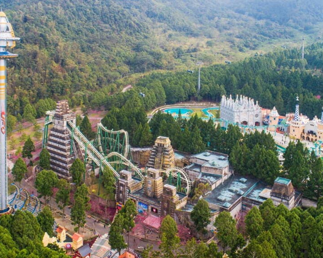 Formosan Aboriginal Culture Village, located near Sun Moon Lake, spans approximately 62 hectares and uniquely combines traditional Indigenous cultural exhibits with amusement park attractions. It features distinct areas such as Indigenous Villages, a European Palace Garden full of seasonal blossoms, and Thrill World with rides like Caribbean Splash water coaster, UFO free-fall, and a Mayan roller coaster. A highlight is the aerial cable car linking the park to Sun Moon Lake, offering panoramic "land, sea, and air" views—making it an iconic multi-sensory destination for families and culture enthusiasts.