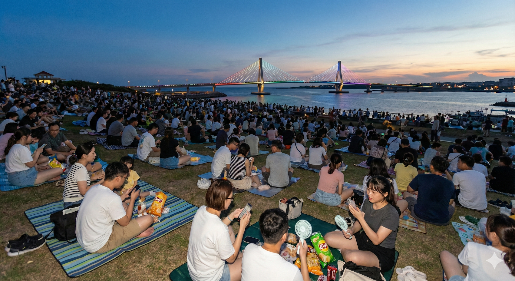 主場煙火最佳距離約 150–350 公尺,能看到完整煙火與倒影。