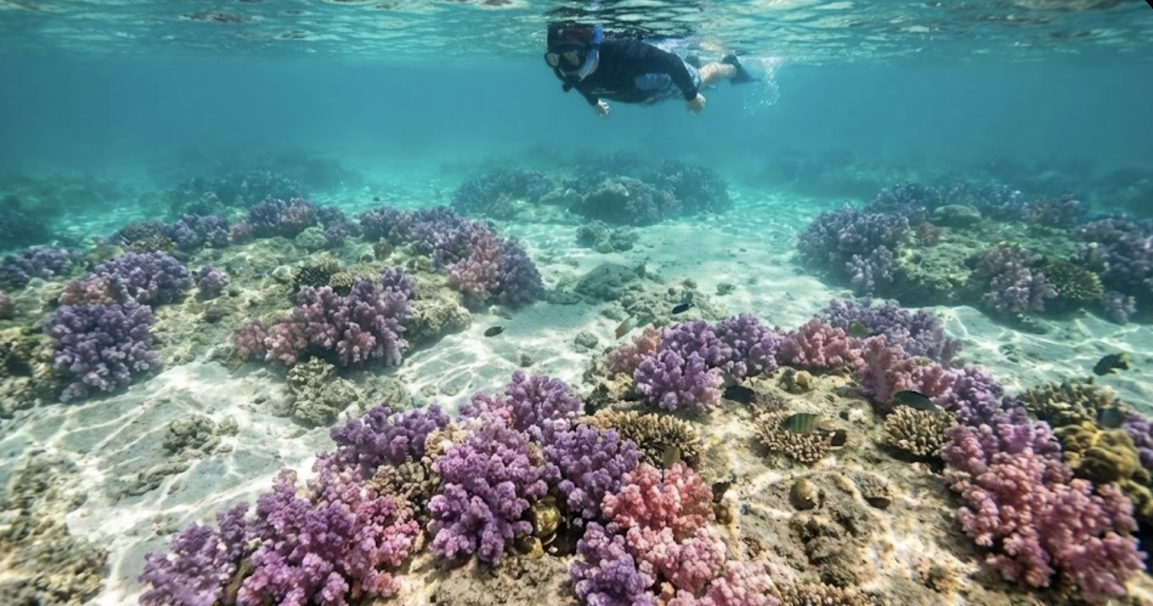 當你漂浮在海面上,看著紫色珊瑚在水中輕輕擺動,